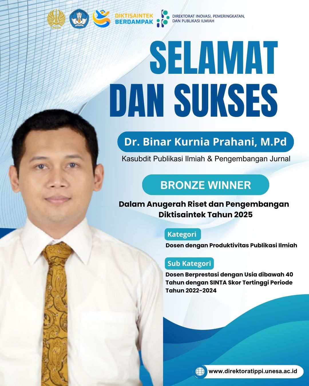 Universitas Negeri Surabaya (Unesa) menyampaikan apresiasi dan ucapan selamat kepada Dr. Binar Kurnia Prahani, M.Pd. atas capaian Bronze Winner pada Anugerah Riset dan Pengembangan Diktisaintek Tahun 2025.Penghargaan tersebut diraih pada kategori Dos