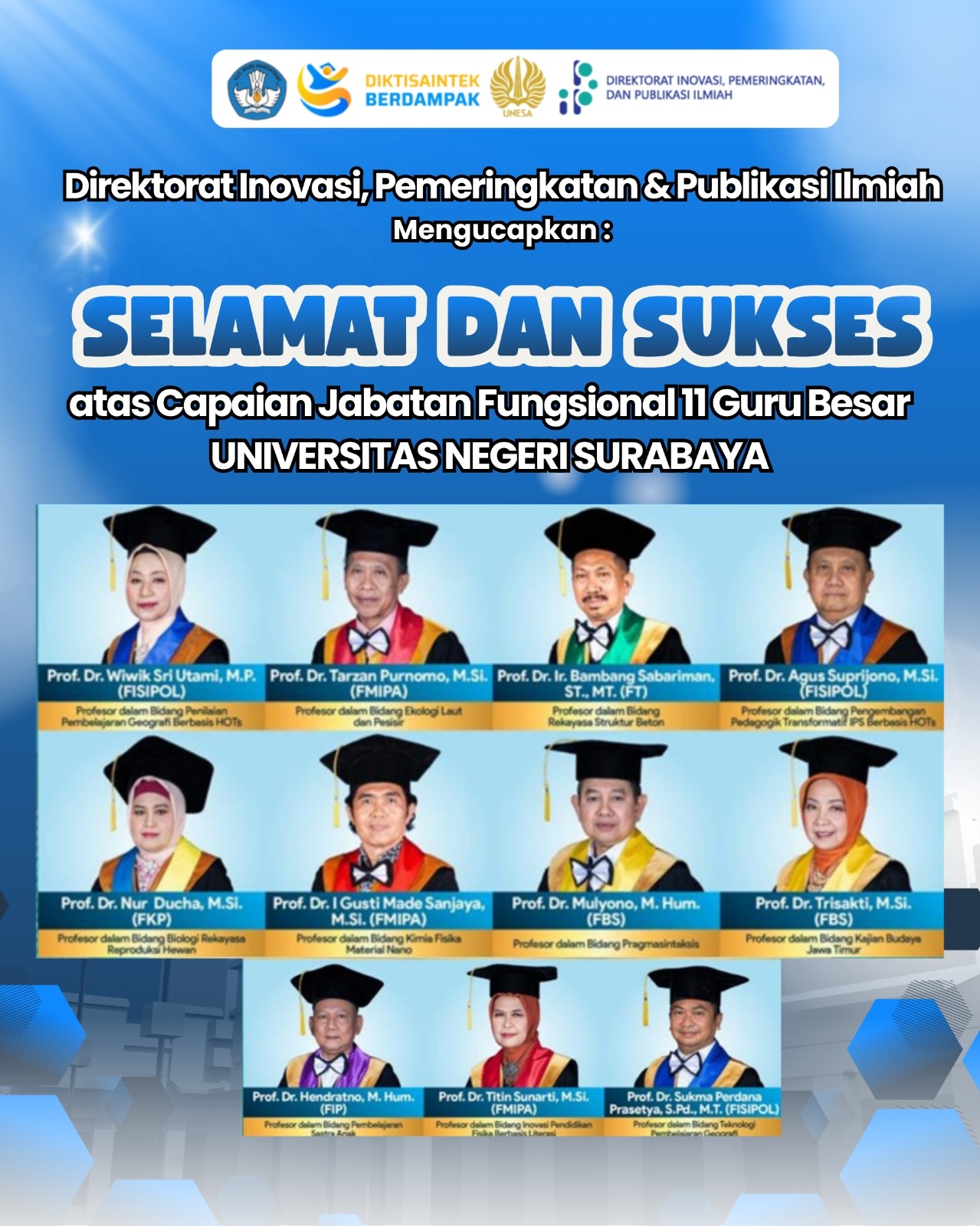 Direktorat Inovasi, Pemeringkatan, dan Publikasi Ilmiah (IPPI) Universitas Negeri Surabaya menyampaikan selamat dan sukses atas capaian jabatan fungsional Guru Besar kepada sembilan dosen terbaik UNESA, yaitu: Prof. Dr. Prima Retno Wikandari, M.Si